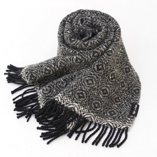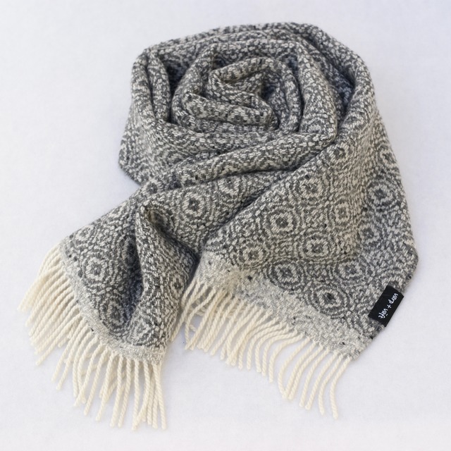 サイズ:約 30cm × 180cm 素材:カシミア、アンゴラ、ウール 経糸にカシミアを使ったとても柔らかなマフラー。 雪の結晶を思わせるスノーフレーク織りで仕立てた、あたたかなマフラーです。柄がくっきりと浮かび上がる表情に手織物ならではの魅力を感じ、制作しました。お手入れの際は必ず手洗いを。ふさ部分は洗うとほどける場合がありますのでご留意ください。