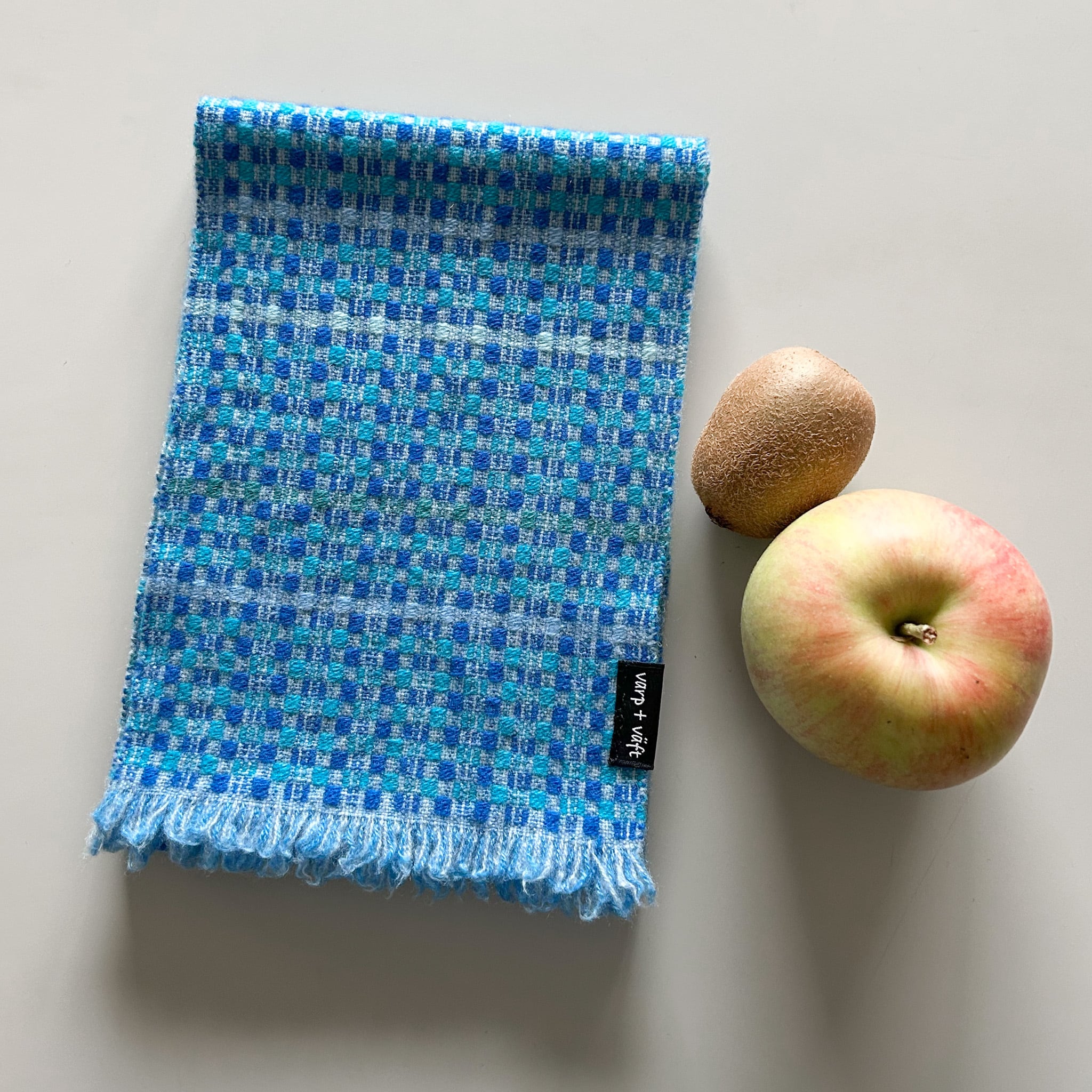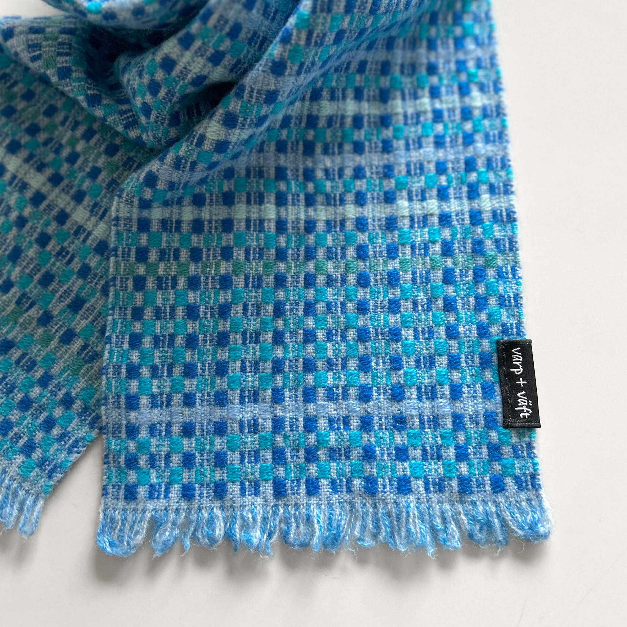 緯糸には上質なカシミヤ糸をふんだんに使い、空気を含むように軽やかで、肌にやさしく馴染みます。鮮やかな青のトーンが、寒い季節の装いに静かな彩りを添えます。