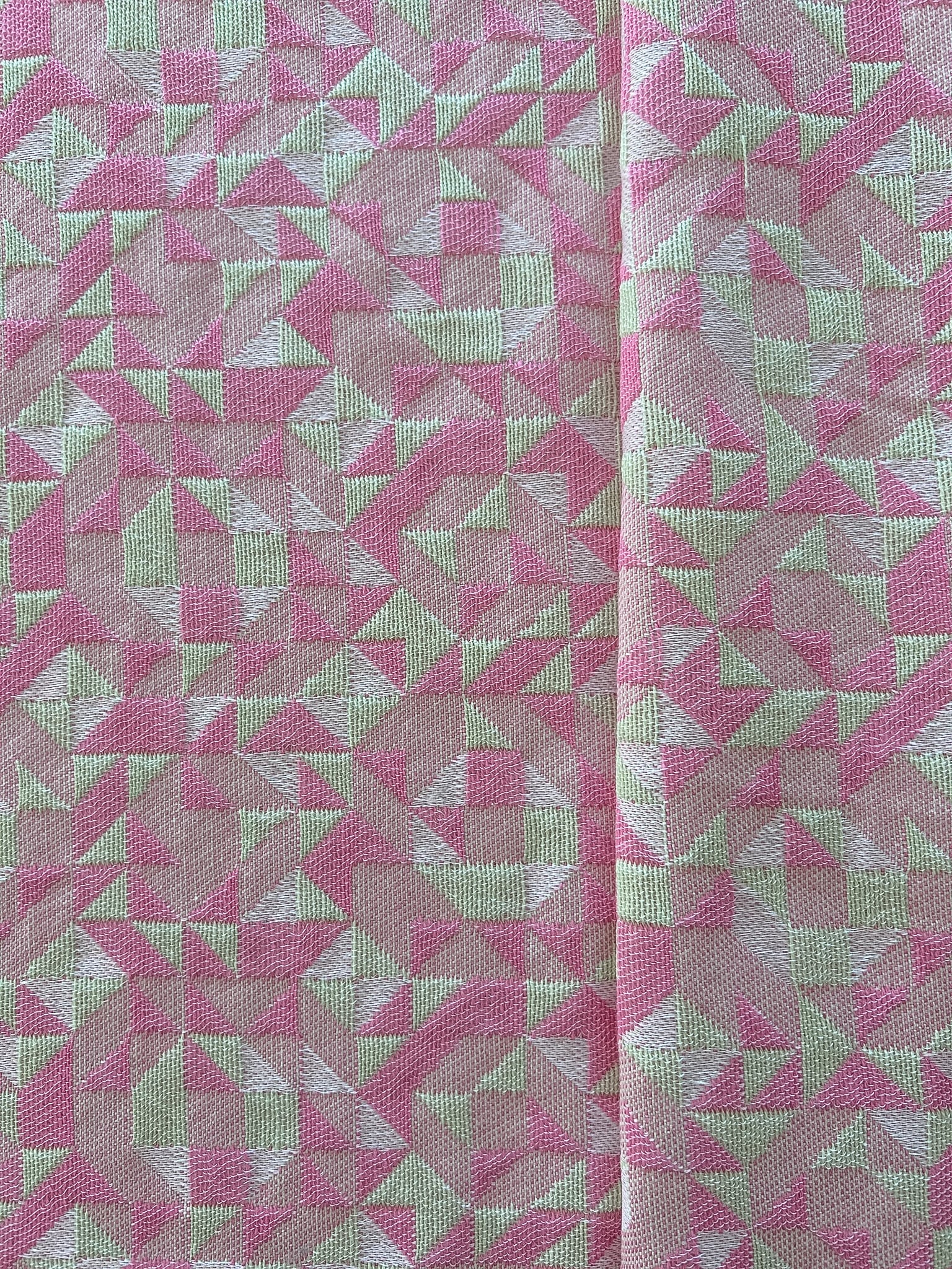 ピンクを基調にしたやわらかな配色と、リズミカルに連なる形が特徴で、軽やか佐野中にやさしい温かみを感じられる一枚です。視線の動きによって様々なパターンが浮かび上がり、見るたびに新しい表情を楽しんでいただけます。
