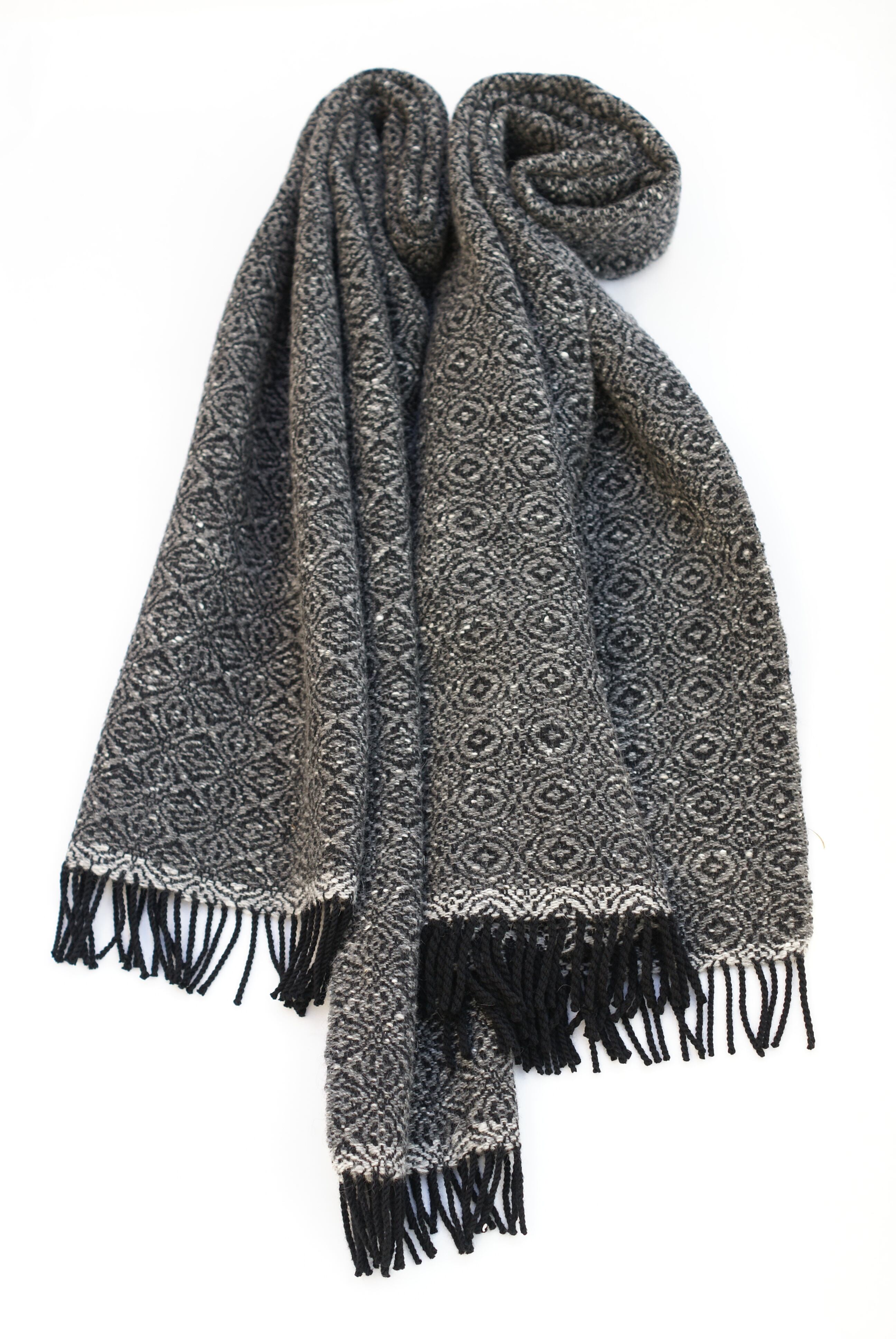 雪の結晶を思わせるスノーフレーク織りで仕立てた、柔らかくあたたかなマフラーです。柄がくっきりと浮かび上がる表情に手織物ならではの魅力を感じ、制作しました。お手入れの際は必ず手洗いを。ふさ部分は洗うとほどける場合がありますのでご留意ください。