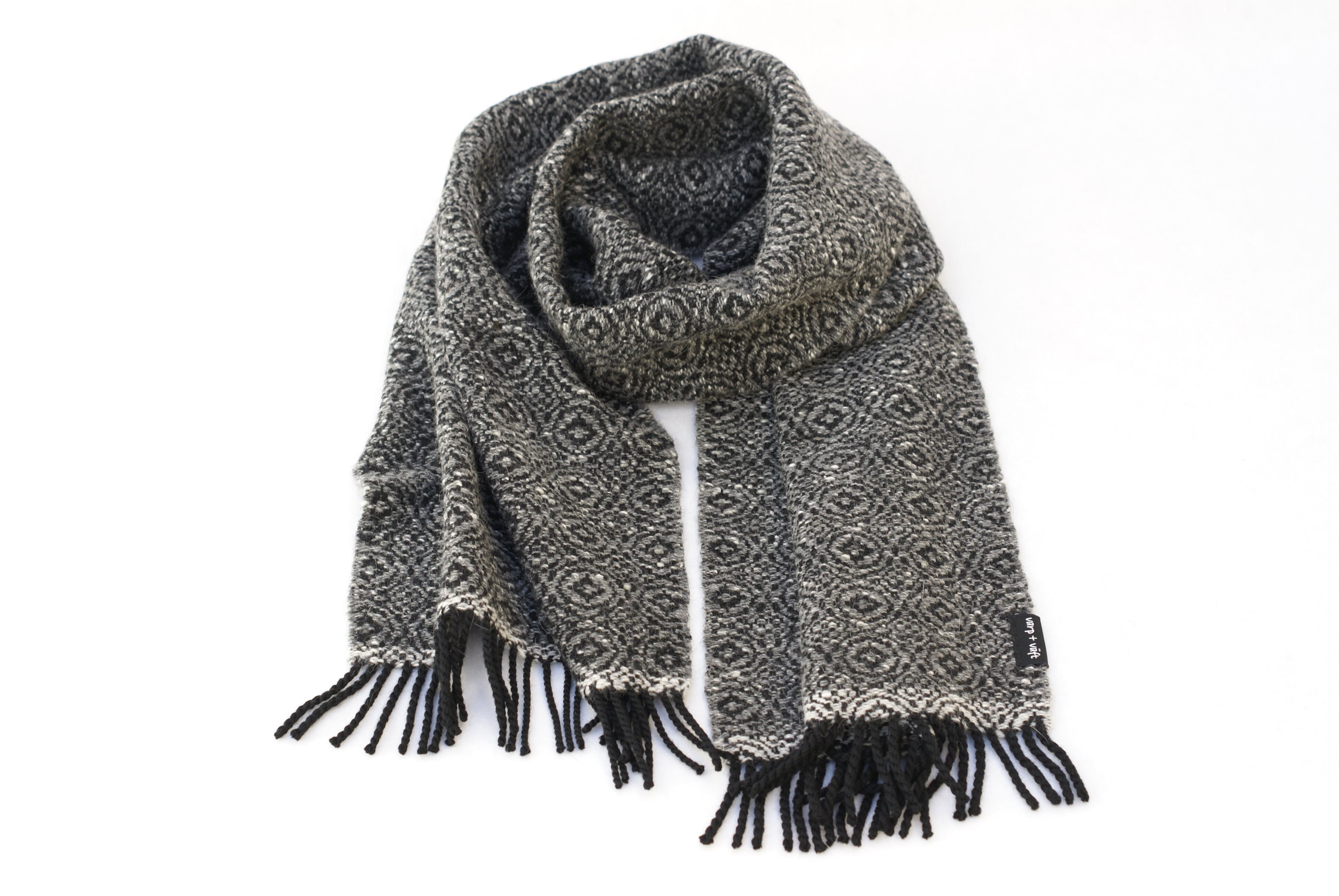 雪の結晶を思わせるスノーフレーク織りで仕立てた、柔らかくあたたかなマフラーです。柄がくっきりと浮かび上がる表情に手織物ならではの魅力を感じ、制作しました。お手入れの際は必ず手洗いを。ふさ部分は洗うとほどける場合がありますのでご留意ください。