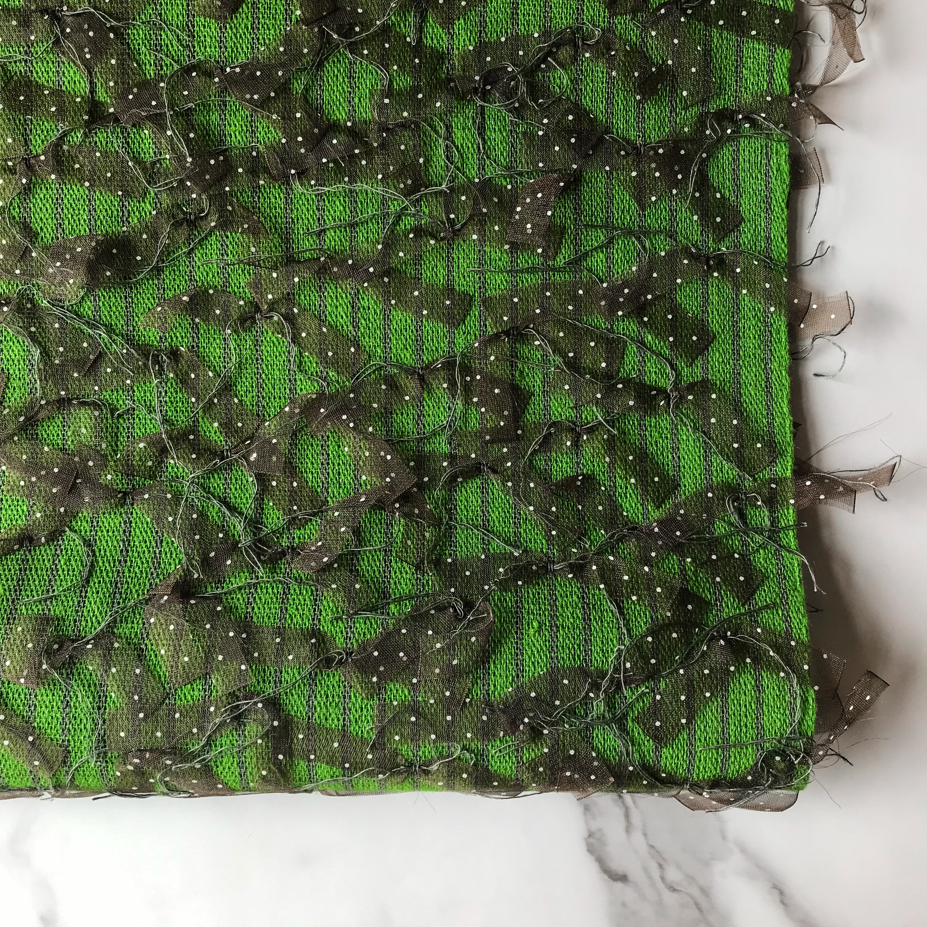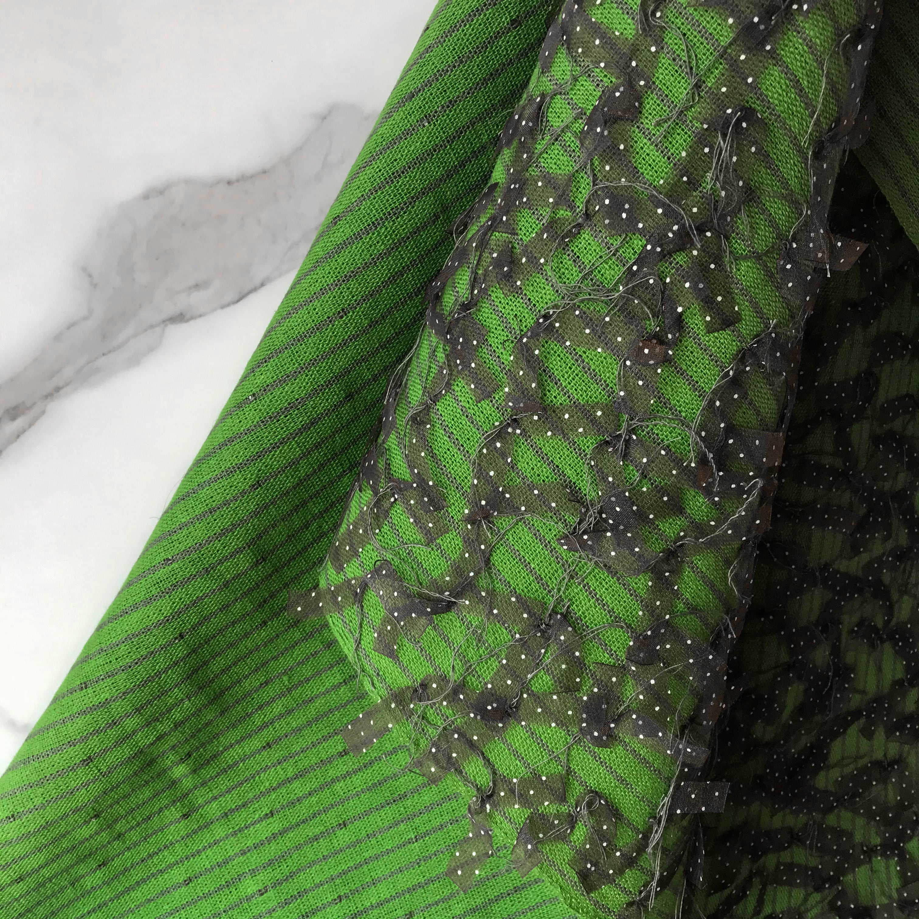 ピンストライプのリネン布に、小さなドット柄のオーガンジーリボンを織り込みました。